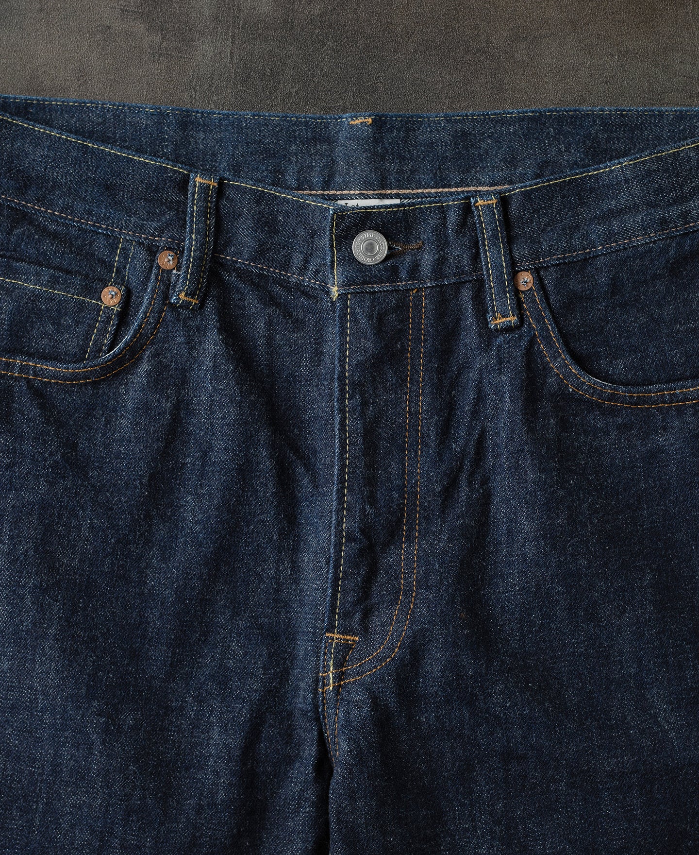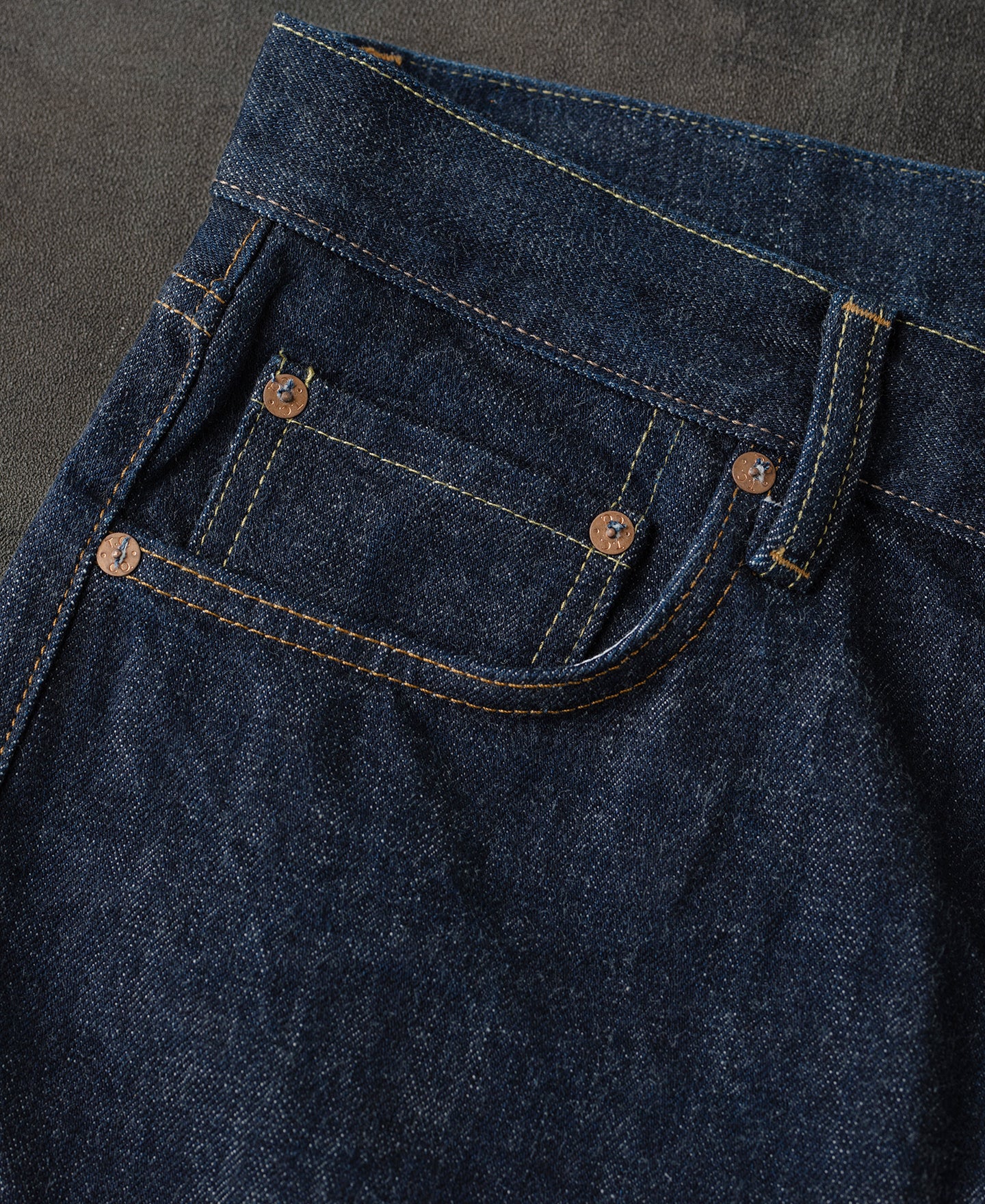 - Copper buttons and red copper rivets.