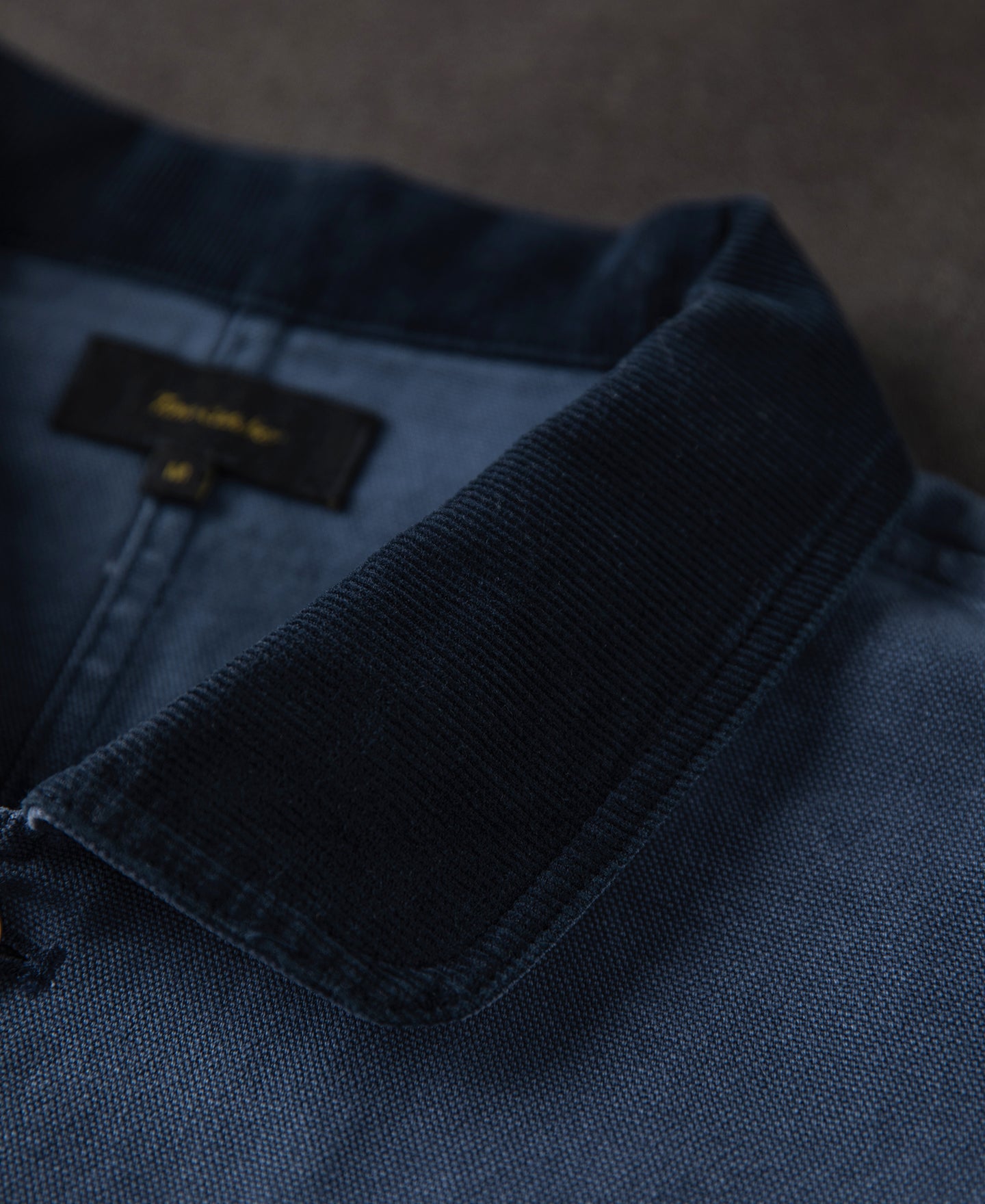 - Navy corduroy trim at collar.