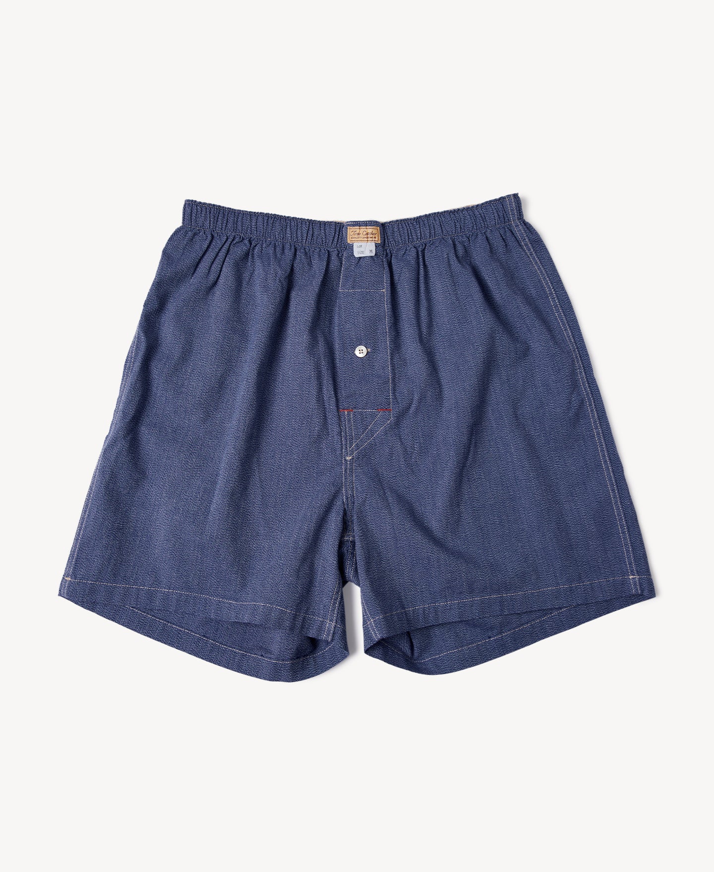The 1950s-style boxer, made of a "Salt & Pepper" cotton fabric, have a soft, no stretchy feel, and a natural shell button on the front fly.