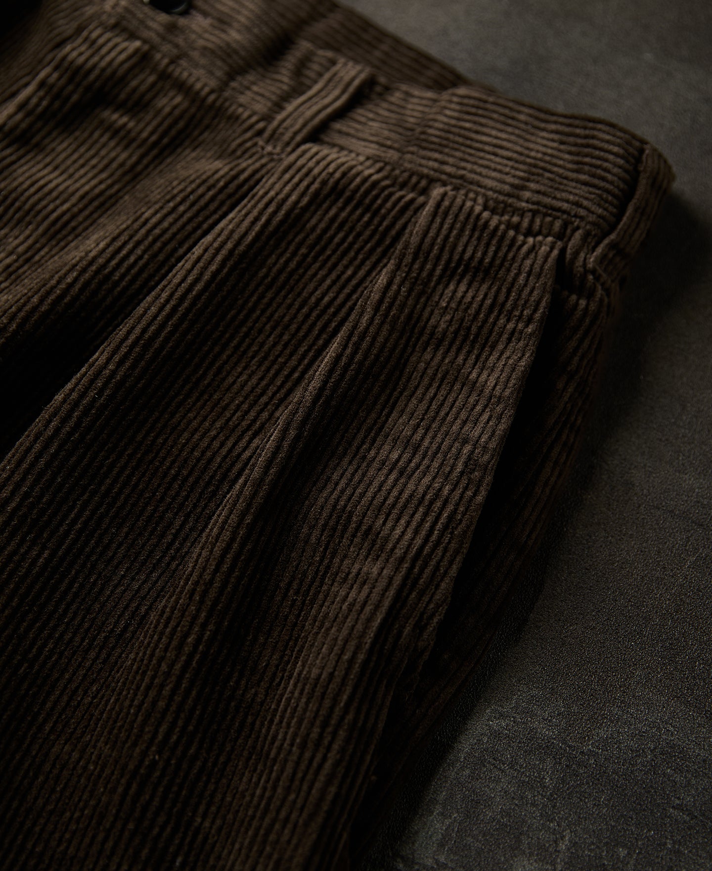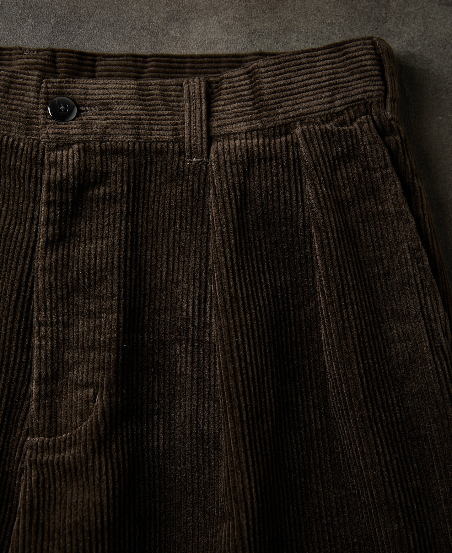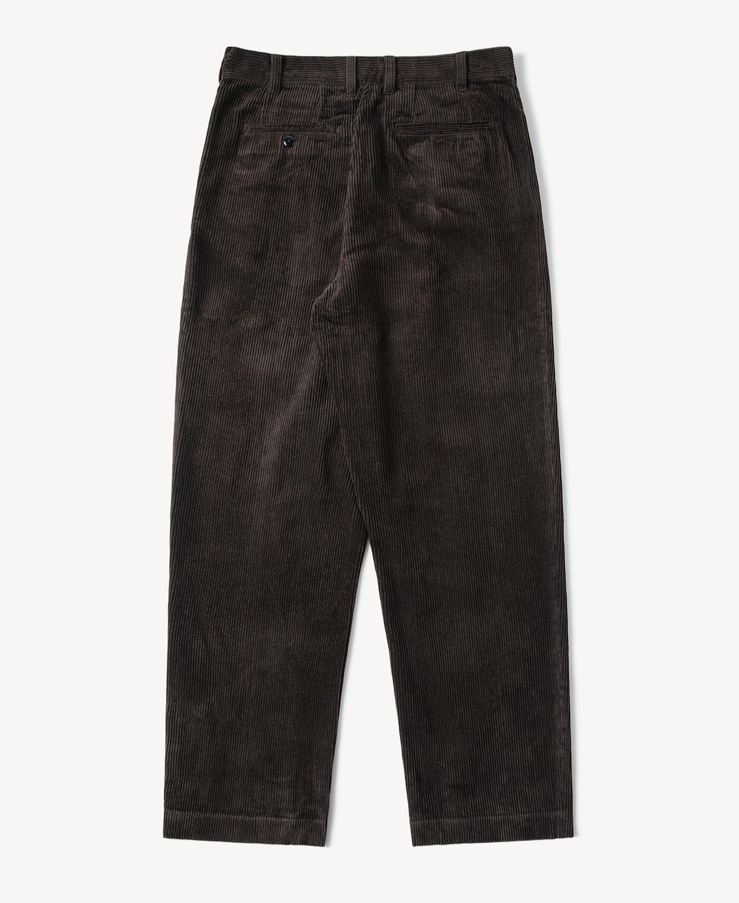 Inspired by 1960s European work trousers, this pair features a double-pleated design with a relaxed wide-leg and mid-high rise fit. Slightly refined for a more modern silhouette and everyday versatility, the trousers are crafted from heavyweight cotton corduroy. Garment-washed for a soft hand and naturally vintage appearance, they combine old-world charm with contemporary wearability.