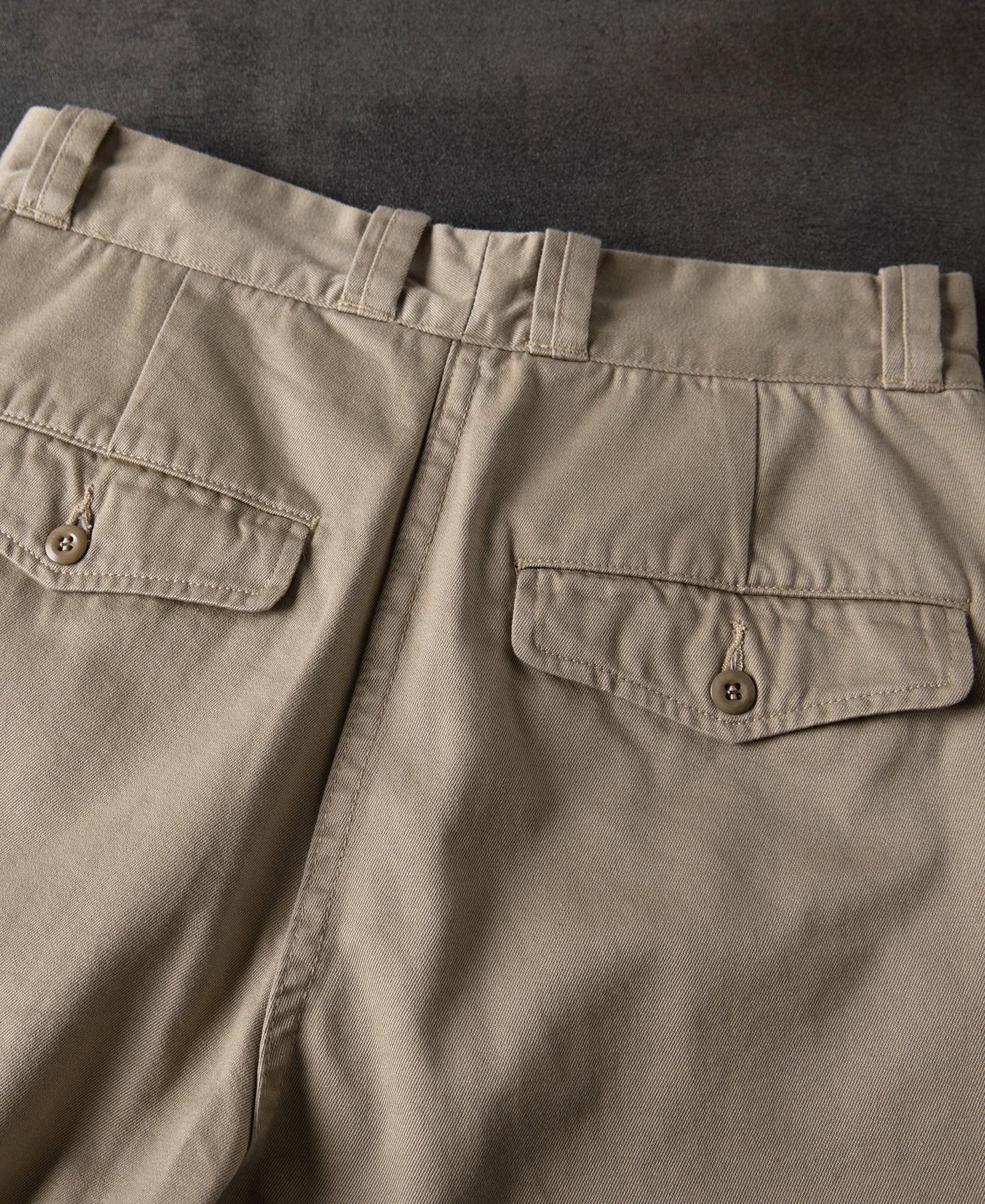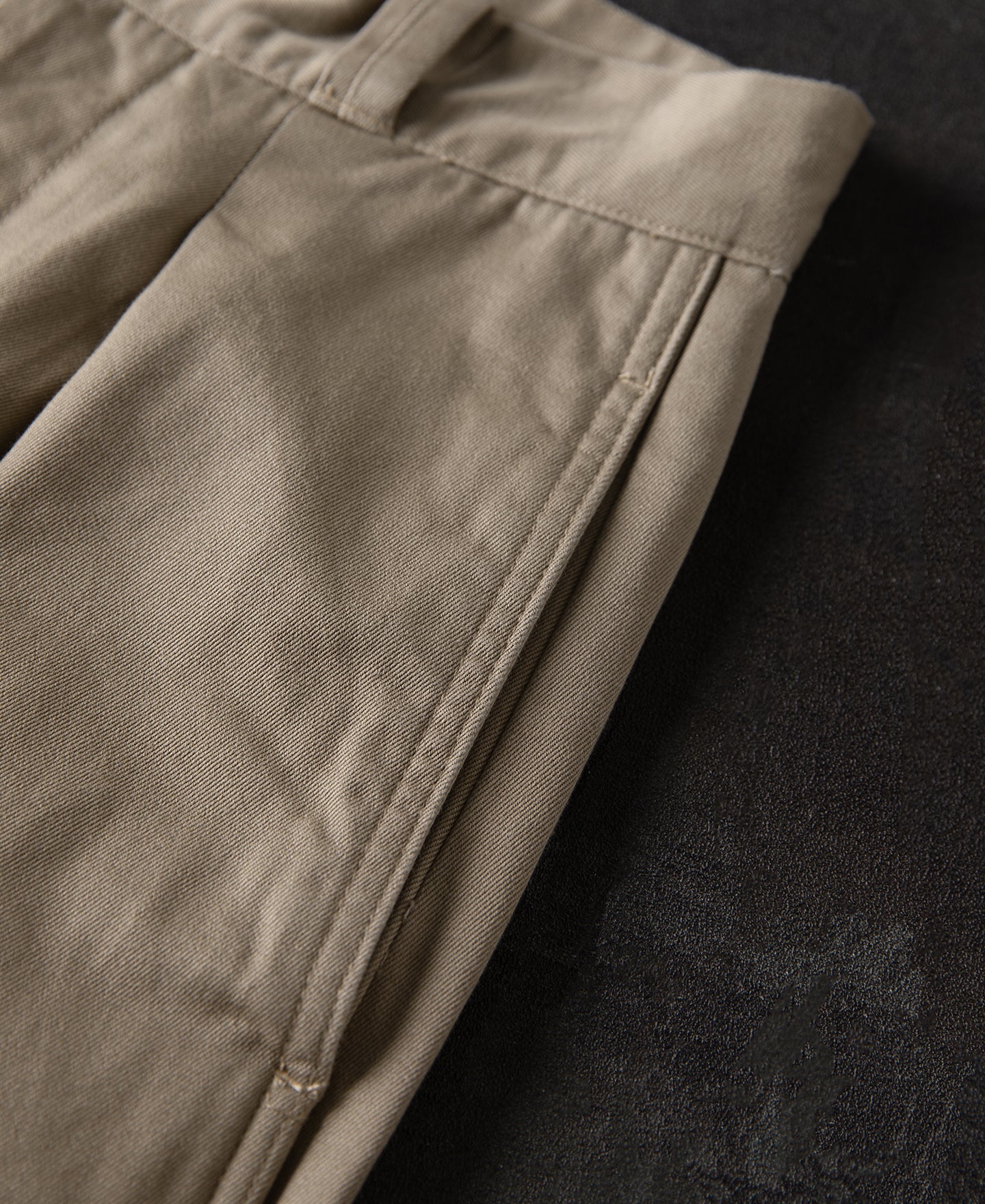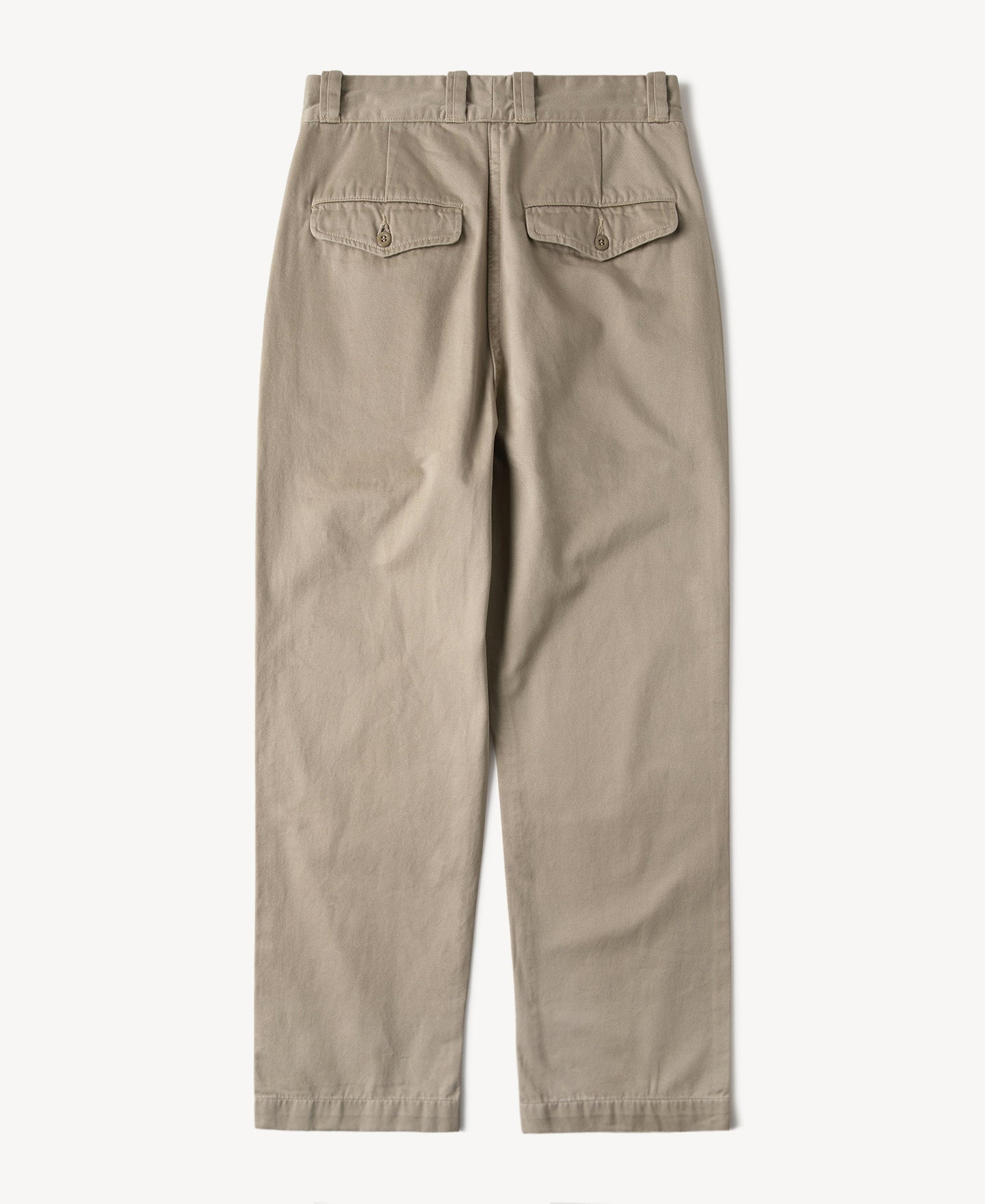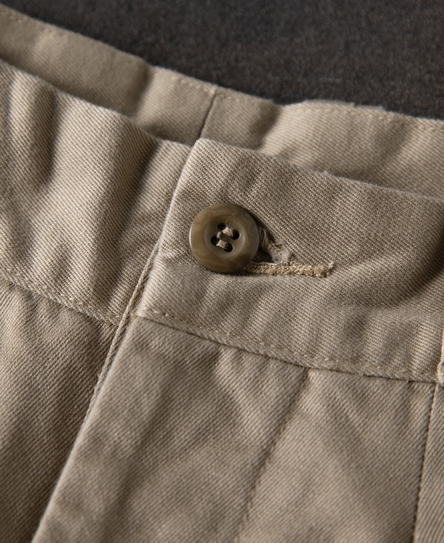 This pair reproduces the rare single-pleated version of the French Army M-1952 Chino Trousers. Crafted from 339 GSM high-density cotton twill fabric, it features a button fly, two side on-seam pockets, and two buttoned pockets at the back. The overall structure presents a high waist and straight leg shape. The design and details of this pair precisely replicate the original version. It has undergone a garment wash to give it a lived-in feel. We stand behind the quality and authenticity of this product.