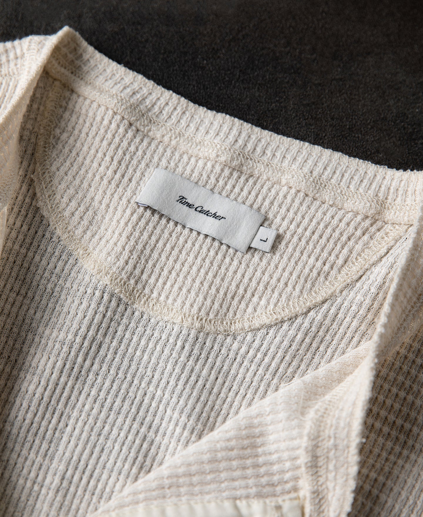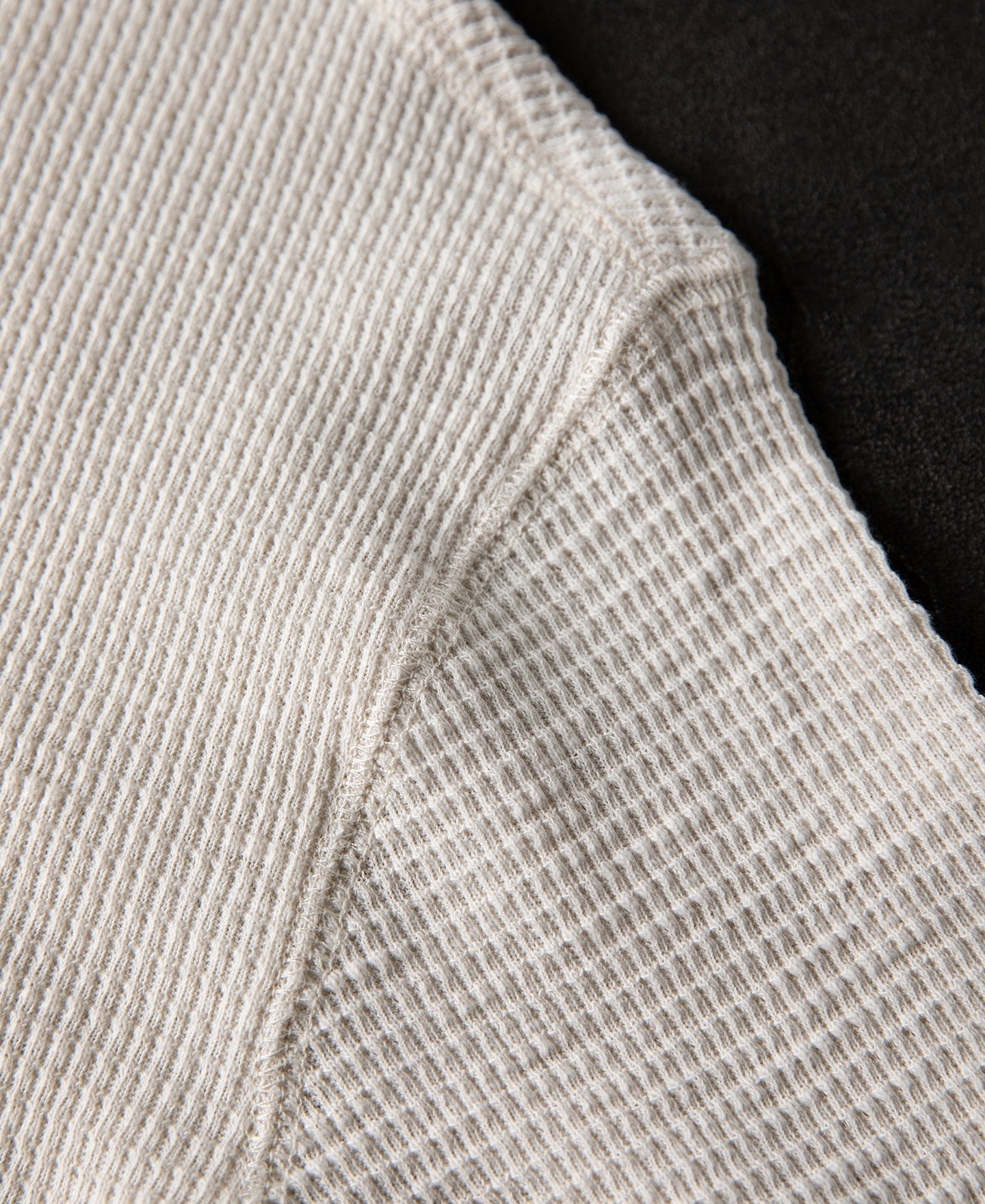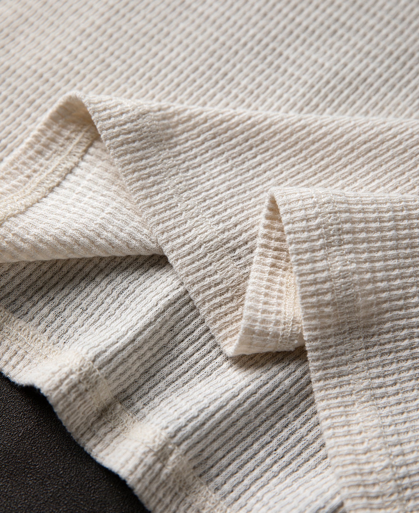 Crafted from a 220 GSM cotton waffle knit—also known as honeycomb for its textured grid pattern—this henley T-shirt combines softness with natural stretch. The raised weave allows for enhanced breathability and comfort, while durable triple-needle stitching ensures a clean, long-lasting finish.