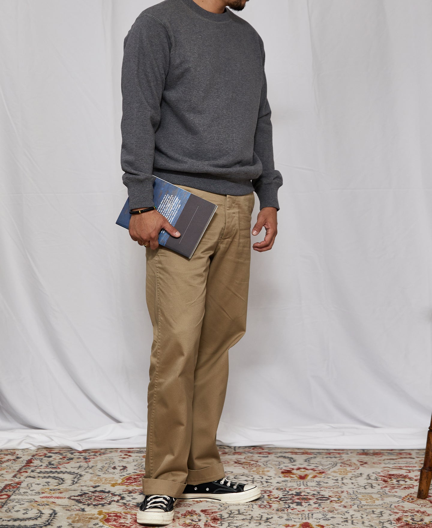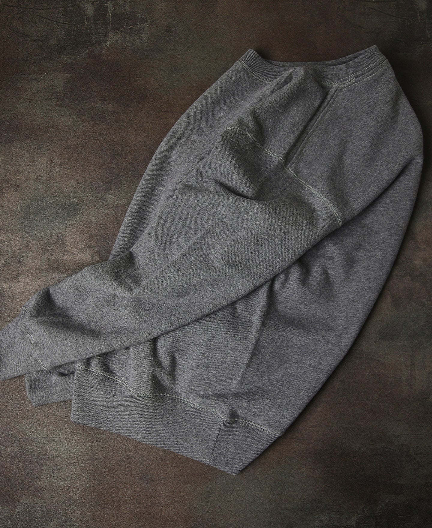 As one of Time Catcher's signature collections, the 'Loopwheeled Tubular Collection' is crafted using the vintage 'Tompkins Upright Rotary Knitting Machine' from the early 20th century. Loopwheel machines are renowned for their slow weaving process, producing only a single meter of fabric every hour, which makes it a costly endeavor. However, the resulting material has a handwoven feel and a stretchy element to it. When worn, it slightly stretches to conform to the body but revert back to its original state after washing. These are qualities and features that modern production techniques cannot replicate.